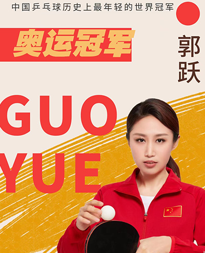 郭躍6歲開始打球,1996年進入省體校,2000年入選國家隊,2004年第47屆世乒賽女團冠軍成員,成為中國乒乓球歷史上最年輕的世界冠軍。2008年北京奧運會和2012年倫敦奧運會連續(xù)兩屆獲得乒乓球女子團體賽冠軍。